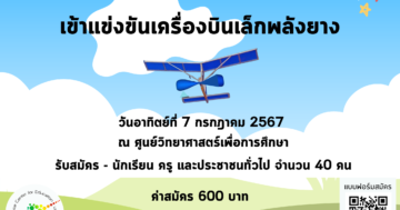 การเล่นเครื่องบินเล็กพลังยางเป็นจุดเริ่มต้นของการแข่งขันเครื่องบินเล็ก โดยเครื่องบินจำลองพลังยางสามารถสร้างได้ด้วยตนเองจากวัสดุนานาชนิด เช่น กระดาษ ไม้ โฟม หรือวัสดุผสมอื่น ๆ ซึ่งให้ทั้งความสนุกเพลิดเพลิน ได้ความรู้เรื่องอากาศพลศาสตร์ ฟิสิกส์และอากาศยาน ตลอดจนเป็นพื้นฐานอันสำคัญในการพัฒนาสู่การเล่นเครื่องบินเล็กได้ ดังนั้นจึงจำเป็นต้องให้ครูและนักเรียนได้เรียนรู้และเข้าใจอย่างถูกต้องเกี่ยวกับการเล่นเครื่องบินเล็กพลังยางก่อนก้าวไปสู่การเล่นเครื่องบินเล็กลักษณะต่าง ๆ ศูนย์วิทยาศาสตร์เพื่อการศึกษาจึงจัดโครงการเตรียมความพร้อมเพื่อเข้าแข่งขันเครื่องบินเล็กพลังยางขึ้น เพื่อเตรียมตัวครูและนักเรียนที่จะเข้าแข่งขันในวันวิทยาศาสตร์แห่งชาติ ประจำปี 2567 ต่อไป กลุ่มเป้าหมาย ครู นักเรียน และประชาชนทั่วไป (อายุ 9 ปี ขึ้นไป) เปิดรับสมัคร 40 คน วันอาทิตย์ที่ 7 กรกฎาคม 2567 วันที่เปิดรับสมัครและชำระเงิน รับสมัคร ตั้งแต่วันจันทร์ที่ 27 พฤษภาคม เวลา 09.00 น. ถึงวันศุกร์ที่ 21 มิถุนายน 2567 เวลา 09.00 น. ชำระเงิน ตั้งแต่วันจันทร์ที่ 27 พฤษภาคม เวลา 12.00 น. ถึงวันศุกร์ที่ 21 มิถุนายน 2567 เวลา […]