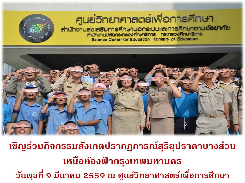 ศูนย์วิทยาศาสตร์เพื่อการศึกษา สำนักงาน กศน. ร่วมกับสมาคมดาราศาสตร์ไทย จัดกิจกรรมเผยแพร่ความรู้และสังเกตการณ์สุริยุปราคาครั้งนี้ โดยในวันอังคารที่ 8 มีนาคม 2559 ท้องฟ้าจำลองกรุงเทพ จะเปิดการแสดง รอบพิเศษ จำนวน 2 รอบ ในเวลา 17.00 น. และ 18.00 น. (ผู้ร่วมกิจกรรมซื้อบัตรเข้าชมได้ตั้งแต่เวลา 16.00 น.) และในวันพุธที่ 9 มีนาคม 2559 จะเริ่มตั้งกล้องดูดาวตั้งแต่ เวลา 04.00 น. เป็นต้นไป เพื่อสังเกตการณ์ปรากฏการณ์ดาวเคราะห์เรียงตัว และในช่วงเช้าจะสังเกตปรากฏการณ์การเกิดสุริยุปราคาที่มองเห็นได้บางส่วน และจัดให้มีการบรรยายเกี่ยวกับปรากฏการณ์สุริยุปราคา เพื่อเผยแพร่ความรู้แก่เยาวชนและประชาชนทั่วไปที่เข้าร่วมกิจกรรม ผู้สนใจสามารถดาวน์โหลดข้อมูลปรากฏการณ์สุริยุปราคาบางส่วนเหนือฟ้ากรุงเทพมหานคร วันพุธที่ 9 มีนาคม 2559 ได้ที่ไฟล์แนบท้ายข่าว สอบถามรายละเอียดการร่วมกิจกรรม โทร. 0 2391 0544 และ 0 2392 1773 หรือ 08 9501 3085