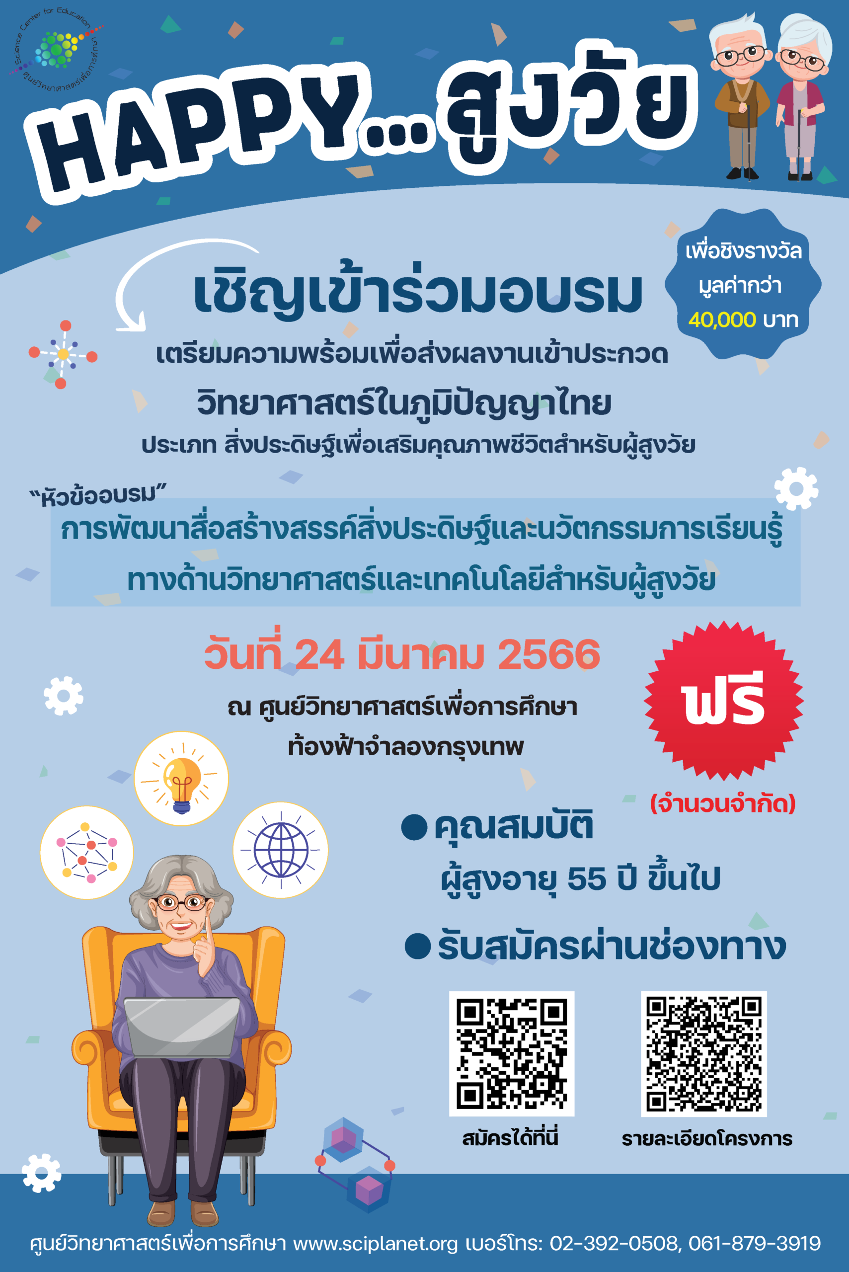 ขอเชิญเข้าร่วมการประกวดแข่งขันนวัตกรรมด้านวิทยาศาสตร์สำหรับผู้สูงวัย “แฮปปี้…สูงวัย” ระดับประเทศ ประจำปีงบประมาณ พ.ศ. 2569 ประเภท สิ่งประดิษฐ์เพื่อช่วยเสริมคุณภาพชีวิตด้านการประกอบอาชีพสำหรับผู้สูงวัย จัดโดยศูนย์ส่งเสริมและพัฒนาการเรียนรู้ทางวิทยาศาสตร์ เพื่อส่งเสริม สนับสนุนและดำเนินการจัดกิจกรรมการเรียนรู้ทางด้านวิทยาศาสตร์และเทคโนโลยี เสริมสร้างทักษะให้กับกลุ่มผู้สูงวัยอย่างต่อเนื่อง โดยเปิดรับผลงานจากบุคคลทั่วไปผู้มีอายุตั้งแต่ 55 ปีขึ้นไป (ต้องผ่านการประกวดระดับพื้นที่จากกลุ่มศูนย์วิทยาศาสตร์เพื่อการศึกษา) ซึ่งผู้ชนะเลิศจะได้รับเงินรางวัล 13,000 บาท พร้อมโล่และเกียรติบัตร และยังมีรางวัลชมเชยอีก 17 รางวัล รวมมูลค่ากว่า 89,000 บาท เงื่อนไขการสมัคร หลักฐานการสมัคร ประกอบด้วย กำหนดการประกวด หมายเหตุ สอบถามรายละเอียด/ติดต่อผู้ประสานงานโครงการ FacebookFacebookXTwitterLINELine