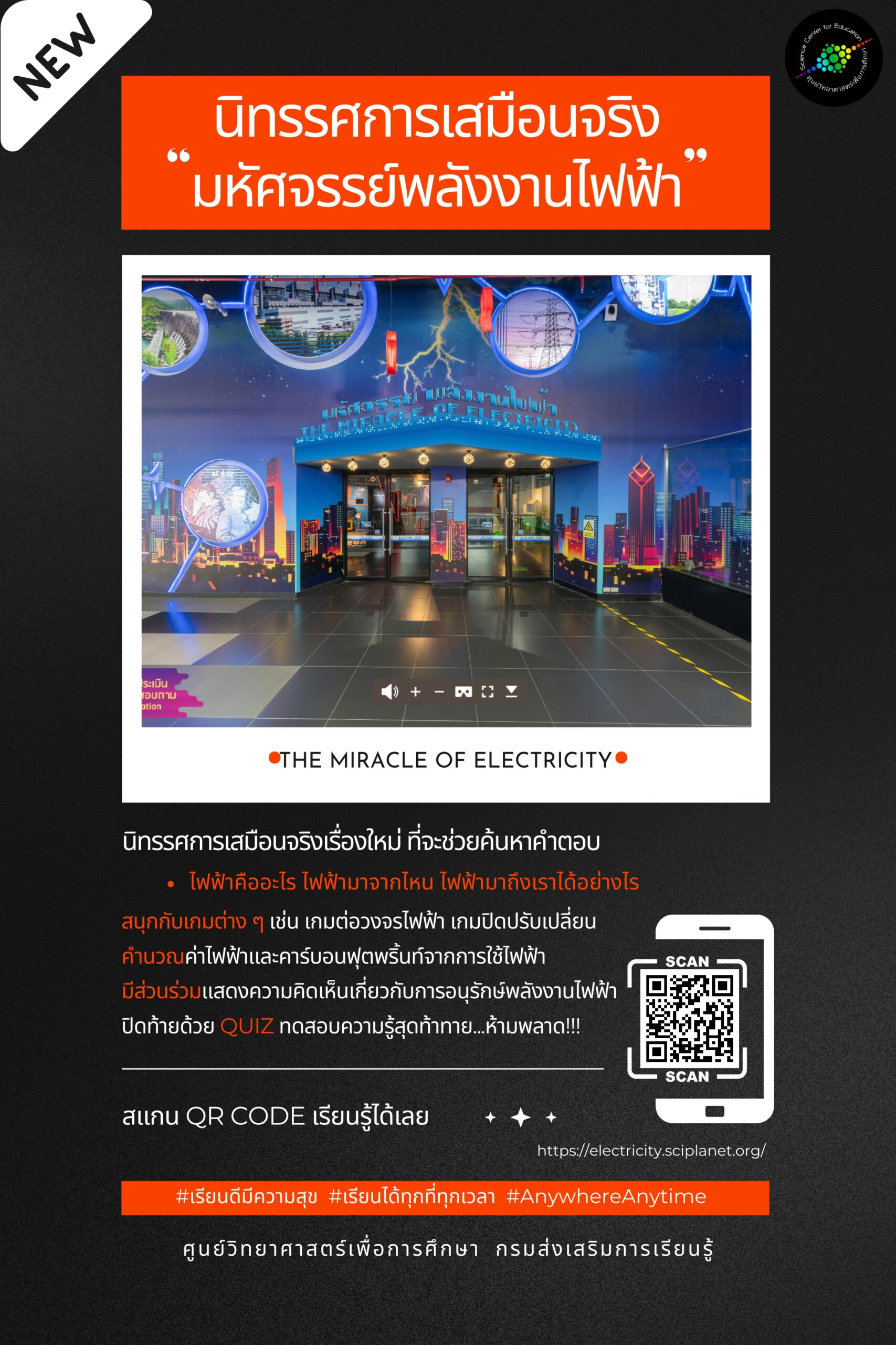 นิทรรศการเสมือนจริงเรื่องใหม่มาแล้วจ้า พบกับนิทรรศการเสมือนจริง เรื่อง มหัศจรรย์พลังงานไฟฟ้า (The Miracle of Electricity) ผู้ชมจะได้เรียนรู้เกี่ยวกับพลังงานไฟฟ้าทุกแง่มุมตั้งแต่จุดเริ่มต้นจนถึงปัจจุบัน เช่น