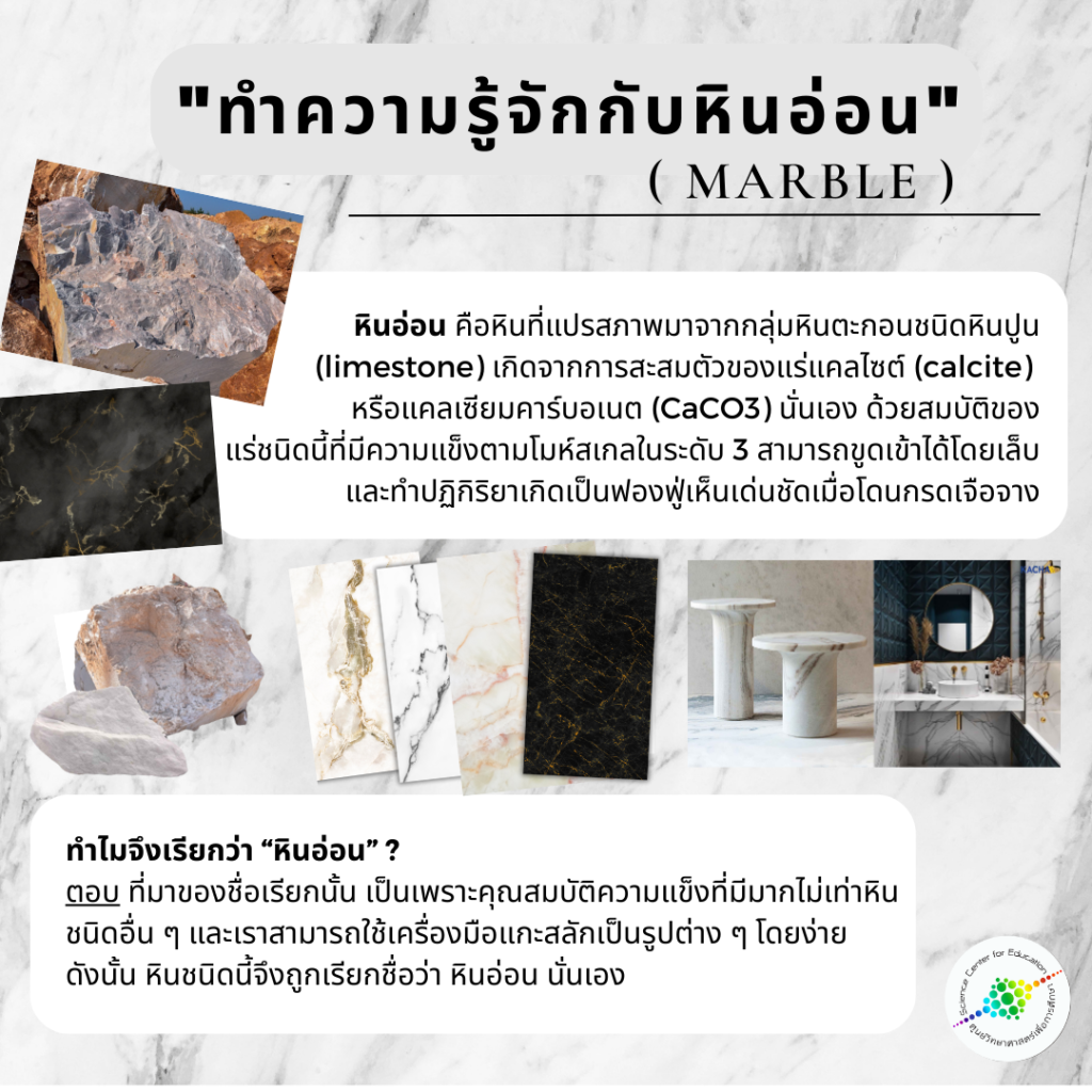 เมื่อครั้งยังเป็นเด็กน้อยวัยละอ่อน ผู้เขียนเคยได้ฟังเพลงที่มีเนื้อร้องว่า “น้ำหยดลงหินทุกวันหินมันยังกร่อน แต่หัวใจอ่อน ๆ ของเธอทำด้วยอะไร” เนื้อเพลงได้เปรียบเทียบถึงความแข็งแรงของหินกับความบอบบางของกล้ามเนื้อหัวใจ ครั้นเติบโตขึ้นมาจึงได้เรียนรู้ว่าในบรรดาหินหลากหลายชนิด มีหินบางชนิดที่ชื่อแสดงถึงความนุ่มนวล นั่นคือ หินอ่อน มารู้จักหินอ่อนกันสักนิดว่าอ่อนจริงเหมือนชื่อหรือไม่