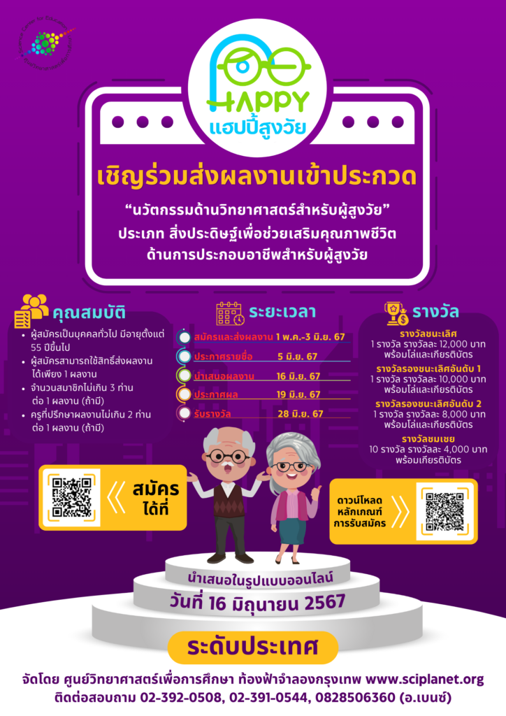 โครงการประกวดนวัตกรรมด้านวิทยาศาสตร์สำหรับผู้สูงวัย “แฮปปี้…สูงวัย” ประจำปีงบประมาณ พ.ศ. 2567 ประเภท สิ่งประดิษฐ์เพื่อช่วยเสริมคุณภาพชีวิตด้านการประกอบอาชีพสำหรับผู้สูงวัย ครั้งนี้ เปิดรับผลงานจากบุคคลทั่วไปผู้มีอายุตั้งแต่ 55 ปีขึ้นไป ซึ่งผู้ชนะเลิศจะได้รับเงินรางวัล 12,000 บาท พร้อมโล่และเกียรติบัตร และยังมีรางวัลชมเชยอีก 10 รางวัล รวมมูลค่ากว่า 40,000 บาท ผู้สนใจสามารถดาวน์โหลดหลักเกณฑ์ การประกวด กำหนดการ ได้จากลิงก์ดาวน์โหลดเอกสารด้านล่าง