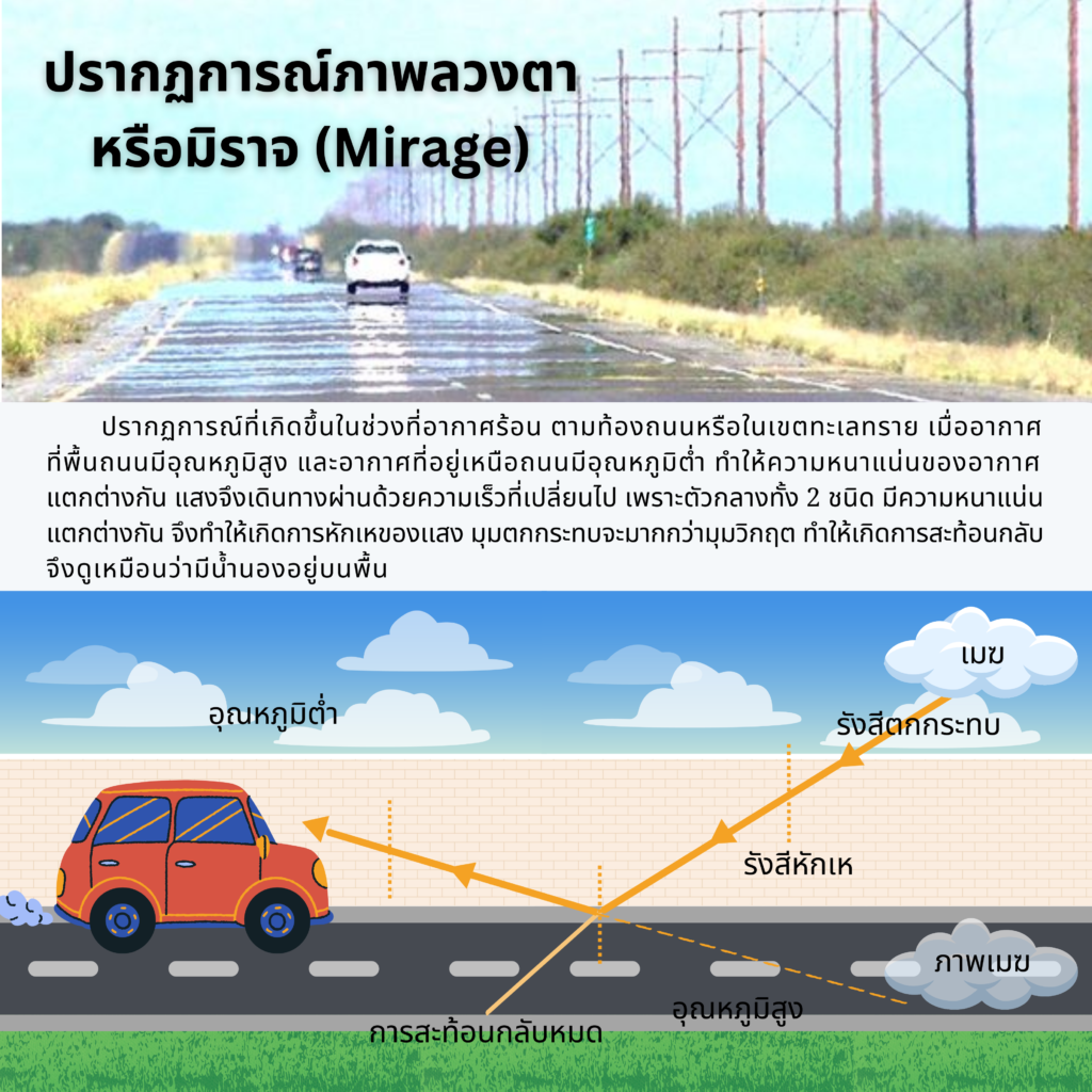 มีใครเคยเห็นแอ่งน้ำบนถนนตอนกลางวันบ้างไหม? แอ่งน้ำนี้มักปรากฏในเวลากลางวัน และเมื่อเราเข้าใกล้จนถึงระยะหนึ่งกลับพบว่าแอ่งน้ำที่เรามองเห็นนั้นหายไป ซึ่งแอ่งน้ำที่เห็นนั้นเกิดจากปรากฏการณ์ภาพลวงตาหรือมิราจ (Mirage)