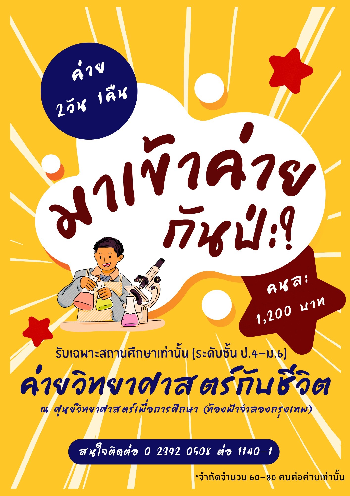 “ค่ายวิทยาศาสตร์กับชีวิต” ค่าย 2 วัน 1 คืน สำหรับสถานศึกษาเท่านั้น เรียนรู้วิทยาศาสตร์ผ่านการทำกิจกรรม ที่ได้รับทั้งความรู้และความสนุกสนาน สามารถเลือกกิจกรรมปฏิบัติการได้ 3 เรื่อง ได้แก่