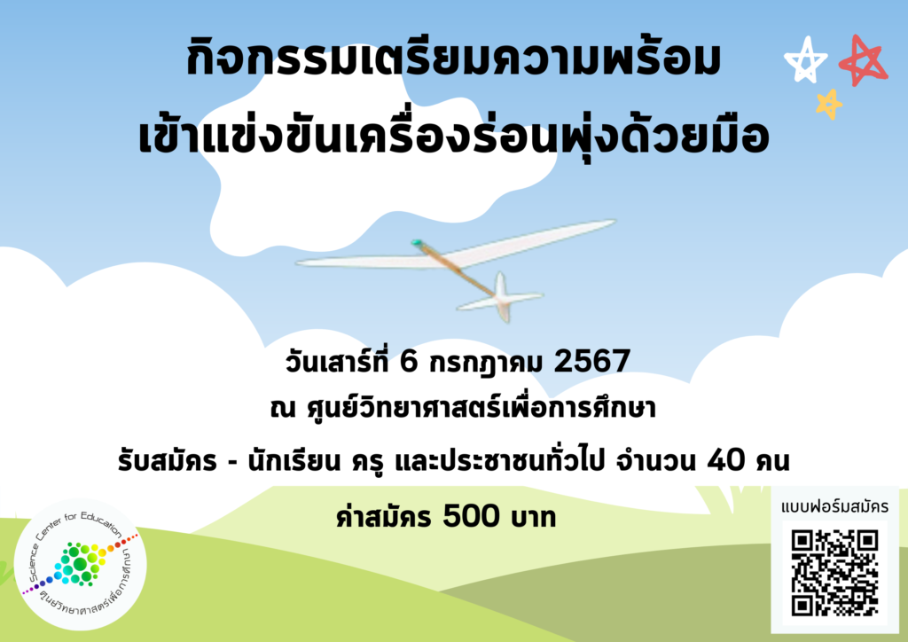 - ประกาศรายชื่อผู้มีสิทธิ์เข้าร่วมอบรม ภายในวันอังคารที่ 11 มิถุนายน 2567 ผ่านทางช่องทางไลน์กลุ่มอบรมเครื่องร่อน และเว็บไซต์ศูนย์วิทยาศาสตร์เพื่อการศึกษา