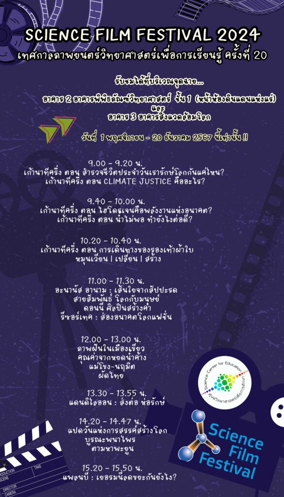 | ตารางฉายภาพยนตร์วิทยาศาสตร์งานเทศกาลภาพยนตร์วิทยาศาสตร์ ครั้งที่ 20 (Science Film Festival 2024) |