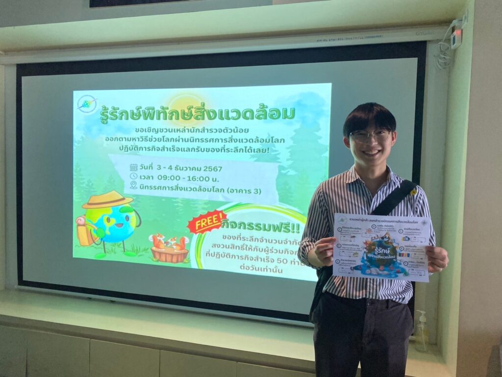 4 ธันวาคม 2567 ศูนย์ส่งเสริมและพัฒนาการเรียนรู้ทางวิทยาศาสตร์ ส่วนวิชาการ จัดกิจกรรม “รู้รักษ์ พิทักษ์สิ่งแวดล้อม” เพื่อเสริมการเรียนรู้ภายในนิทรรศการแบบไม่มีค่าใช้จ่าย ผู้ร่วมกิจกรรมทำภารกิจค้นหาคำตอบจากใบงานผ่านนิทรรศการแวดล้อมโลก สำหรับ 50 ท่านแรกที่ร่วมกิจกรรมและทำภารกิจสำเร็จ รับของที่ระลึกสุดพิเศษ “พวงกุญแจรักษ์โลก” จัดกิจกรรมระหว่างวันที่ 3 – 4 ธันวาคม 2567 ณ นิทรรศการสิ่งแวดล้อมโลก (อาคาร 3) ศูนย์ส่งเสริมและพัฒนาการเรียนรู้ทางวิทยาศาสตร์