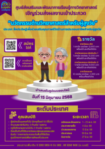 ขอเชิญเข้าร่วมการประกวดแข่งขันนวัตกรรมด้านวิทยาศาสตร์สำหรับผู้สูงวัย “แฮปปี้…สูงวัย” ระดับประเทศ ประจำปีงบประมาณ พ.ศ. 2569 ประเภท สิ่งประดิษฐ์เพื่อช่วยเสริมคุณภาพชีวิตด้านการประกอบอาชีพสำหรับผู้สูงวัย จัดโดยศูนย์ส่งเสริมและพัฒนาการเรียนรู้ทางวิทยาศาสตร์ เพื่อส่งเสริม สนับสนุนและดำเนินการจัดกิจกรรมการเรียนรู้ทางด้านวิทยาศาสตร์และเทคโนโลยี เสริมสร้างทักษะให้กับกลุ่มผู้สูงวัยอย่างต่อเนื่อง โดยเปิดรับผลงานจากบุคคลทั่วไปผู้มีอายุตั้งแต่ 55 ปีขึ้นไป (ต้องผ่านการประกวดระดับพื้นที่จากกลุ่มศูนย์วิทยาศาสตร์เพื่อการศึกษา) ซึ่งผู้ชนะเลิศจะได้รับเงินรางวัล 13,000 บาท พร้อมโล่และเกียรติบัตร และยังมีรางวัลชมเชยอีก 17 รางวัล รวมมูลค่ากว่า 89,000 บาท เงื่อนไขการสมัคร หลักฐานการสมัคร ประกอบด้วย กำหนดการประกวด หมายเหตุ สอบถามรายละเอียด/ติดต่อผู้ประสานงานโครงการ FacebookFacebookXTwitterLINELine