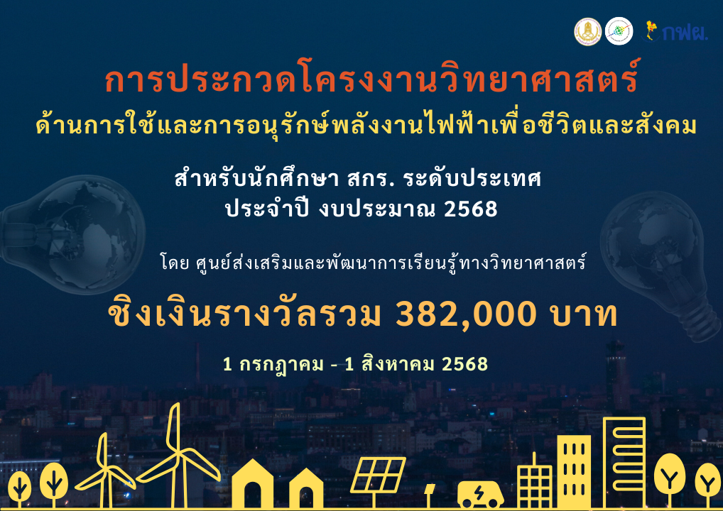โครงการประกวดโครงงานวิทยาศาสตร์สำหรับนักศึกษา สกร. ระดับประเทศ ประจำปีงบประมาณ พ.ศ. 2568 ด้านการใช้และการอนุรักษ์พลังงานไฟฟ้าเพื่อชีวิตและสังคม รับสมัครนักศึกษา สกร.ที่ได้ รับรางวัลชนะเลิศและรองชนะเลิศอันดับ 1 จากการประกวดระดับพื้นที่ที่จัดโดยศูนย์วิทยาศาสตร์เพื่อการศึกษา 19 แห่งทั่วประเทศ เงินรางวัลรวม 382,000 บาท พร้อมโล่และเกียรติบัตร