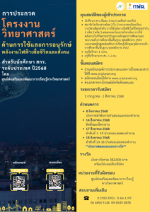 ขอเชิญเข้าร่วมการประกวดแข่งขันนวัตกรรมด้านวิทยาศาสตร์สำหรับผู้สูงวัย “แฮปปี้…สูงวัย” ระดับประเทศ ประจำปีงบประมาณ พ.ศ. 2569 ประเภท สิ่งประดิษฐ์เพื่อช่วยเสริมคุณภาพชีวิตด้านการประกอบอาชีพสำหรับผู้สูงวัย จัดโดยศูนย์ส่งเสริมและพัฒนาการเรียนรู้ทางวิทยาศาสตร์ เพื่อส่งเสริม สนับสนุนและดำเนินการจัดกิจกรรมการเรียนรู้ทางด้านวิทยาศาสตร์และเทคโนโลยี เสริมสร้างทักษะให้กับกลุ่มผู้สูงวัยอย่างต่อเนื่อง โดยเปิดรับผลงานจากบุคคลทั่วไปผู้มีอายุตั้งแต่ 55 ปีขึ้นไป (ต้องผ่านการประกวดระดับพื้นที่จากกลุ่มศูนย์วิทยาศาสตร์เพื่อการศึกษา) ซึ่งผู้ชนะเลิศจะได้รับเงินรางวัล 13,000 บาท พร้อมโล่และเกียรติบัตร และยังมีรางวัลชมเชยอีก 17 รางวัล รวมมูลค่ากว่า 89,000 บาท เงื่อนไขการสมัคร หลักฐานการสมัคร ประกอบด้วย กำหนดการประกวด หมายเหตุ สอบถามรายละเอียด/ติดต่อผู้ประสานงานโครงการ FacebookFacebookXTwitterLINELine