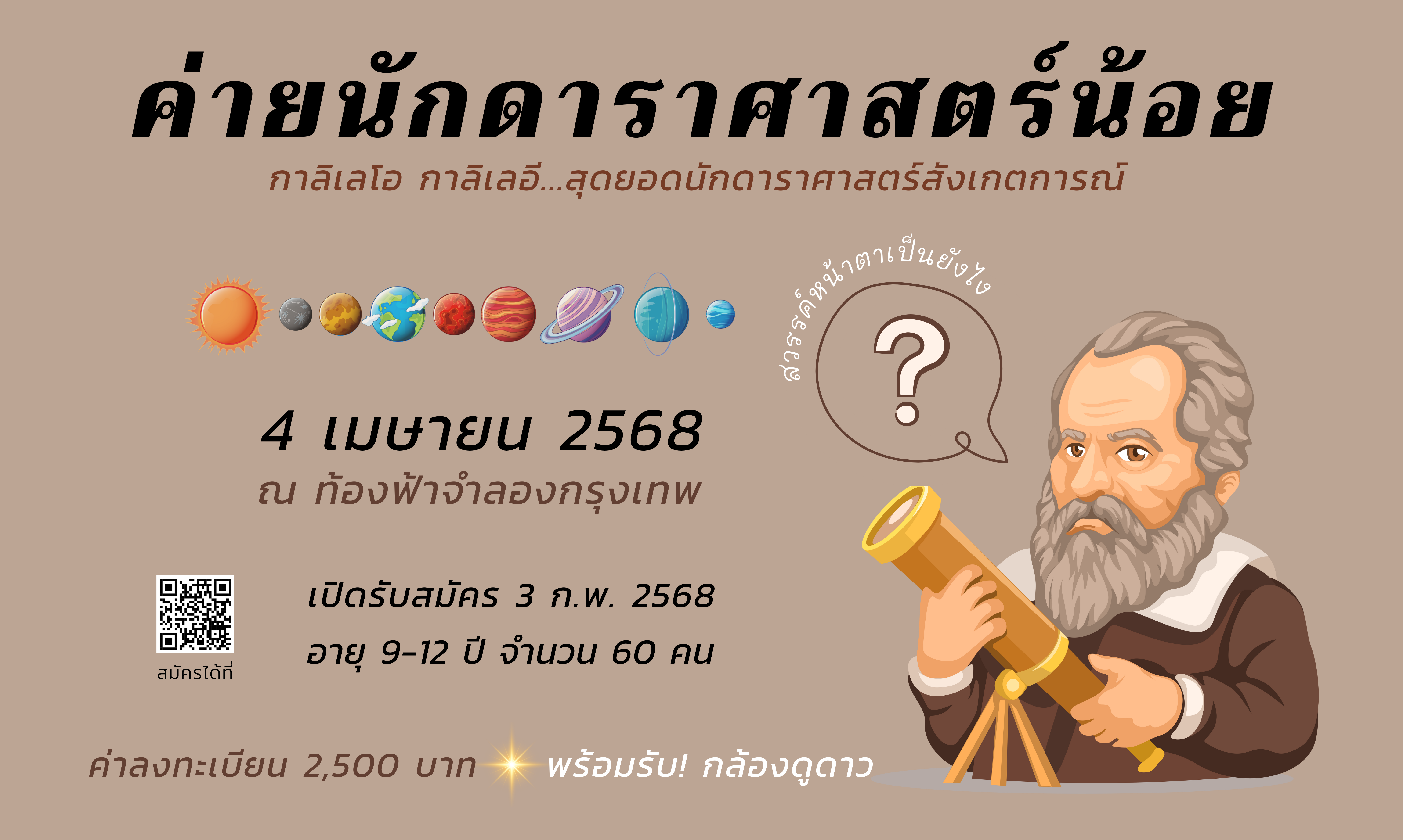 ค่าย 1 วัน สนุกสนานไปกับกิจกรรมกลุ่มเพื่อพิสูจน์ข้อค้นพบด้านดาราศาสตร์ของกาลิเลโอ กาลิเลอี ผ่านฐานกิจกรรมการเรียนรู้ เช่น เรียนรู้เกี่ยวกับกล้องโทรทรรศน์ ดวงอาทิตย์ ดวงจันทร์ และโลก รวมถึงปรากฏการณ์ต่าง ๆ ที่มีอิทธิพลต่อมนุษย์ซึ่งช่วยให้เข้าใจเอกภพมากขึ้น นอกจากนี้จะได้มีโอกาสสัมผัสประสบการณ์ดูดาวผ่านการแสดงท้องฟ้าจำลองและภาพยนตร์เต็มโดม การดูดาวจริงด้วยตาเปล่า และการใช้กล้องโทรทรรศน์สังเกตดวงจันทร์ ดาวบริวารของดาวพฤหัสบดี รวมถึงวัตถุท้องฟ้าอื่นที่สวยงามยามค่ำคืน