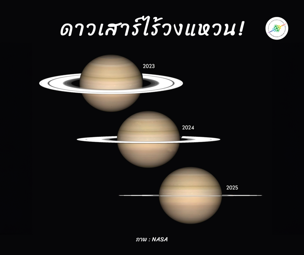 แต่ในการโคจรรอบดวงอาทิตย์บางช่วง วงแหวนดาวเสาร์หันด้านข้างที่บางเฉียบเข้าหาโลก ทำให้คนบนโลกมองเห็นดาวเสาร์เหมือน “ไร้วงแหวน”
