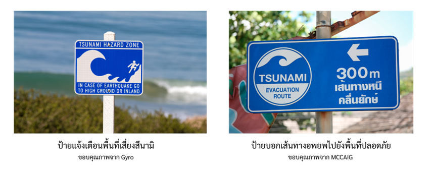- ศึกษาและเรียนรู้เกี่ยวกับพื้นที่ที่มีโอกาสเกิดคลื่นสึนามิ ควรสังเกตป้ายที่บ่งบอกเส้นทางการอพยพจากคลื่นสึนามิ และพื้นที่ปลอดภัยในชุมชนนั้น ๆ