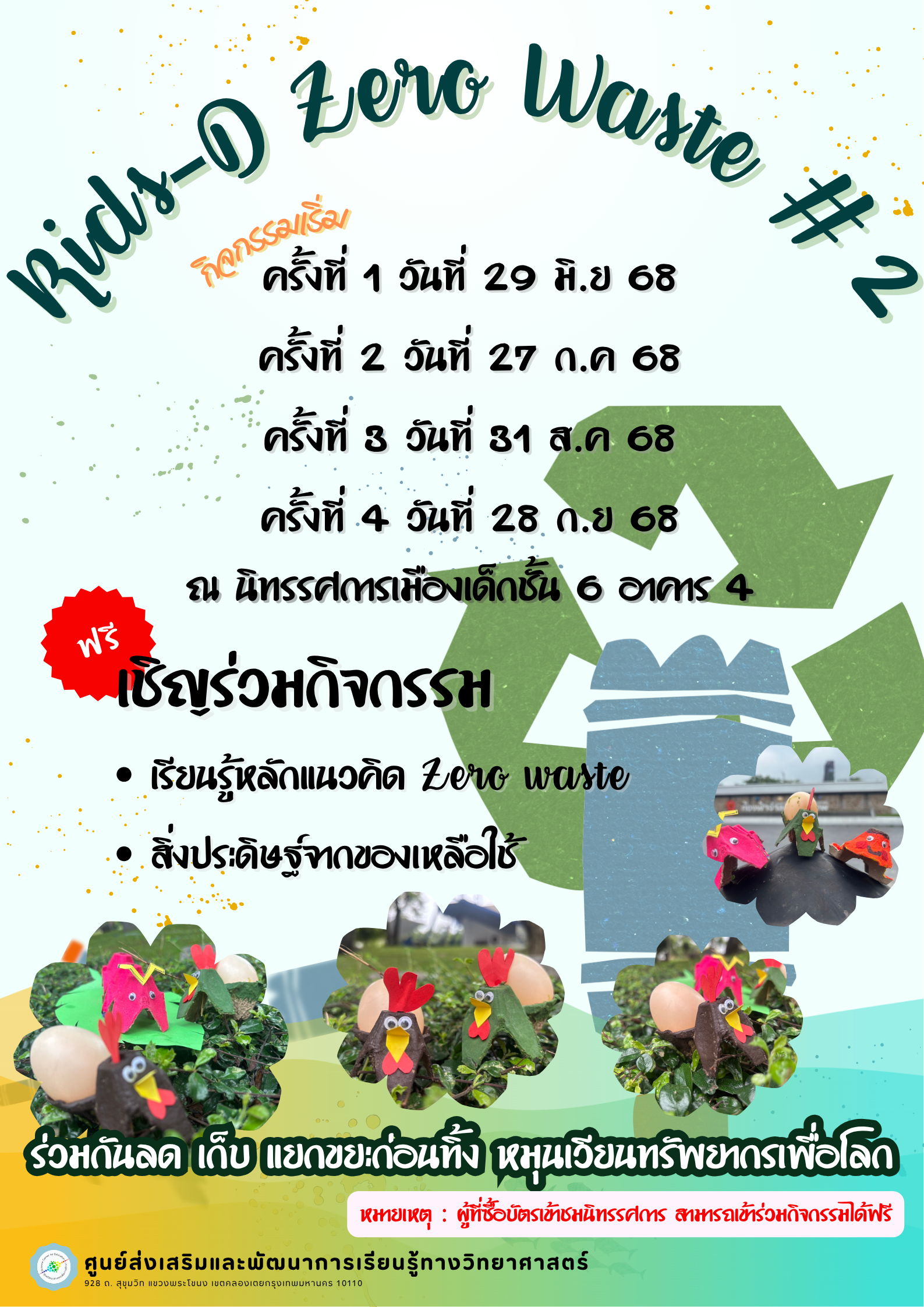ศูนย์ส่งเสริมและพัฒนาการเรียนรู้ทางวิทยาศาสตร์ กลุ่มส่งเสริมกิจกรรมการเรียนรู้ งานวิทยาศาสตร์ปฐมวัย จัดกิจกรรม Kids-D Zero Waste #2 เพื่อให้เด็ก ๆ ได้เรียนรู้หลักแนวคิด Zero Waste และทำกิจกรรมสิ่งประดิษฐ์จากของเหลือใช้ “ร่วมกันลด เก็บ แยกขยะก่อนทิ้ง หมุนเวียนทรัพยากรเพื่อโลก” โดยจัดกิจกรรมทั้งหมด 4 ครั้ง ได้แก่