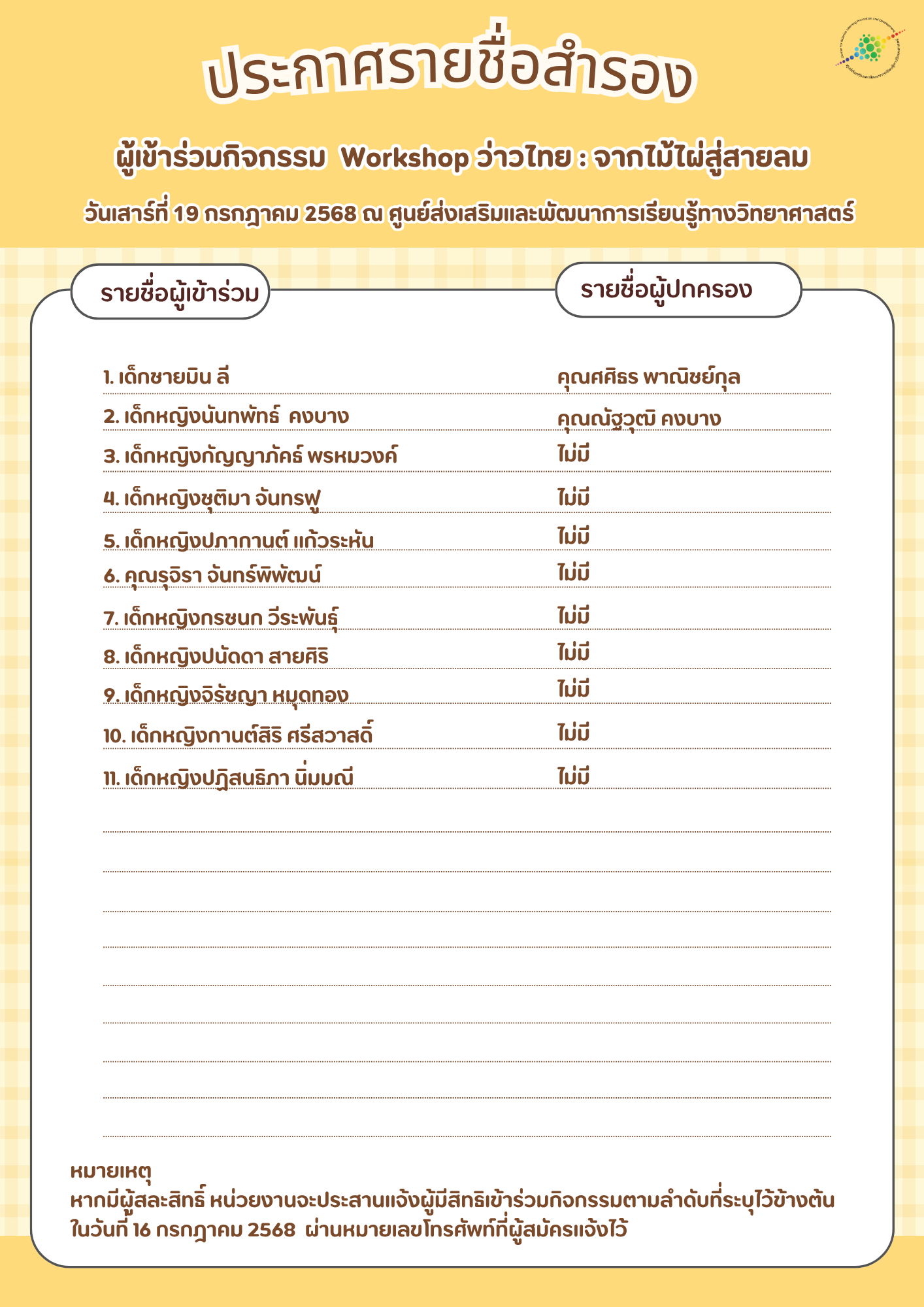 ศูนย์ส่งเสริมและพัฒนาการเรียนรู้ทางวิทยาศาสตร์ กลุ่มพัฒนาวิชาการ ขอเชิญร่วมกิจกรรม Workshop ว่าวไทย: จากไม้ไผ่สู่สายลม กิจกรรมภายใต้โครงการ ห้องเรียนนวัตกรรมภูมิปัญญา “วิทย์ในวิถีภูมิปัญญา” เพื่อเปิดโอกาสให้ผู้เข้าร่วมได้เรียนรู้การทำว่าวไทย (ว่าวจุฬา และปักเป้า) จากผู้เชี่ยวชาญด้านภูมิปัญญาท้องถิ่น (ปราชญ์ชาวบ้าน) โดยตรง