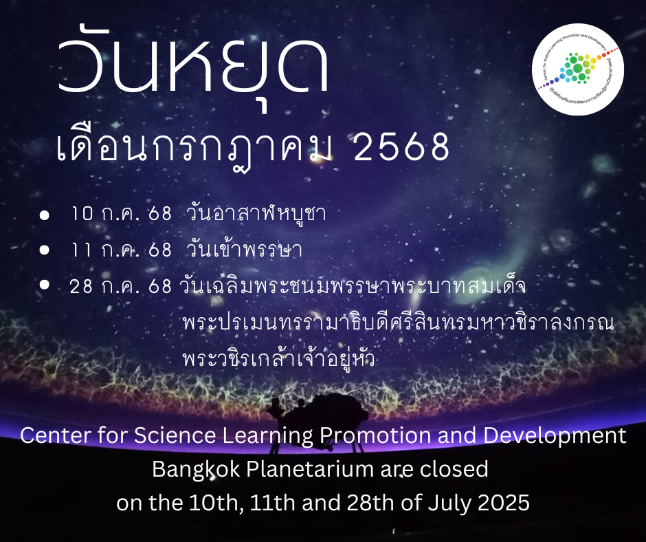ศูนย์ส่งเสริมและพัฒนาการเรียนรู้ทางวิทยาศาสตร์ กรมส่งเสริมการเรียนรู้ ปิดบริการในวันจันทร์และวันหยุดนักขัตฤกษ์ โดยปิดบริการในวันหยุดนักขัตฤกษ์ เดือนกรกฎาคม 2568 ดังนี้