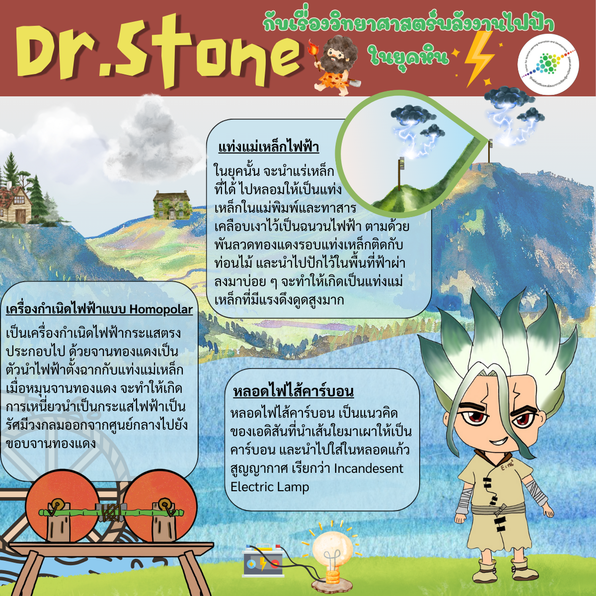 ปัจจุบัน สื่อบันเทิงอย่างอนิเมะได้รับความนิยมเป็นอย่างมาก ไม่เพียงแต่ให้ความสนุกสนานเท่านั้น แต่ยังสามารถเป็นสื่อการเรียนรู้ที่ช่วยให้เข้าใจแนวคิดทางวิทยาศาสตร์ได้ง่ายขึ้น Dr. Stone เป็นตัวอย่างที่ดีของการใช้ความรู้ทางวิทยาศาสตร์เพื่อเอาชีวิตรอดในโลกที่ปราศจากเทคโนโลยี โดยเฉพาะเรื่องของการผลิตพลังงานไฟฟ้า ซึ่งเป็นหัวใจสำคัญในการพัฒนาอารยธรรมมนุษย์