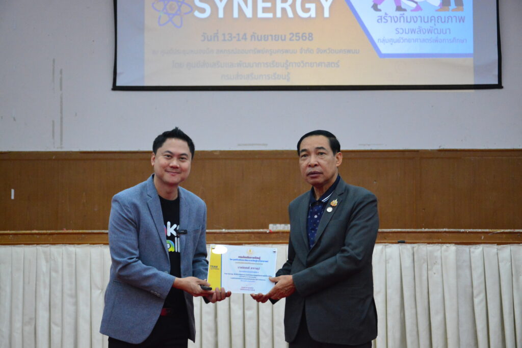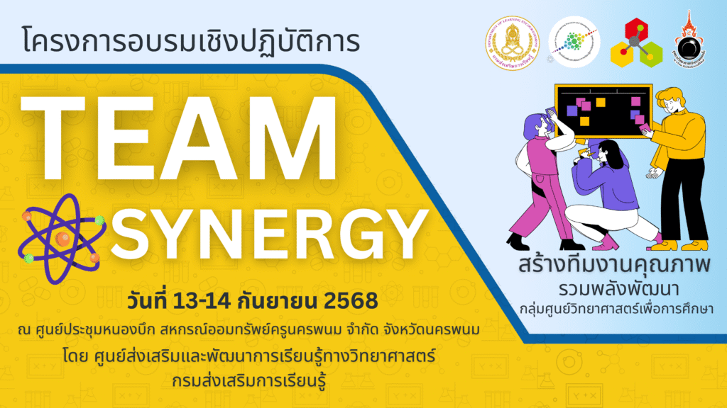 ศูนย์ส่งเสริมและพัฒนาการเรียนรู้ทางวิทยาศาสตร์ กรมส่งเสริมการเรียนรู้ จัดโครงการอบรมเชิงปฏิบัติการ Team Synergy: สร้างทีมงานคุณภาพ รวมพลังกลุ่มศูนย์วิทยาศาสตร์เพื่อการศึกษา ระหว่างวันที่ 13-14 กันยายน 2568 ให้กับบุคลากรศูนย์ส่งเสริมและพัฒนาการเรียนรู้ทางวิทยาศาสตร์ และศูนย์วิทยาศาสตร์เพื่อการศึกษา (สถานศึกษา) 19 แห่ง ทั่วประเทศ ณ ศูนย์ประชุมหนองบึก สหกรณ์ออมทรัพย์ครูนครพนม จำกัด จังหวัดนครพนม เพื่อพัฒนาสมรรถนะบุคลากรให้นำไปใช้ปฏิบัติงานได้จริง ส่งเสริมการแลกเปลี่ยนเรียนรู้ระหว่างหน่วยงาน รวมถึงพัฒนาความร่วมมือและเครือข่ายการทำงาน โดยได้รับเกียรติจากนายธนากร ดอนเหนือ อธิบดีกรมส่งเสริมการเรียนรู้ เป็นประธานเปิดงานและบรรยายพิเศษ