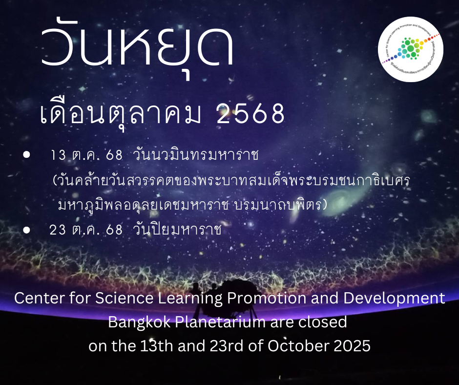 ศูนย์ส่งเสริมและพัฒนาการเรียนรู้ทางวิทยาศาสตร์ กรมส่งเสริมการเรียนรู้ ปิดบริการในวันจันทร์และวันหยุดนักขัตฤกษ์ โดยปิดบริการในวันหยุดนักขัตฤกษ์ เดือนตุลาคม 2568 ดังนี้