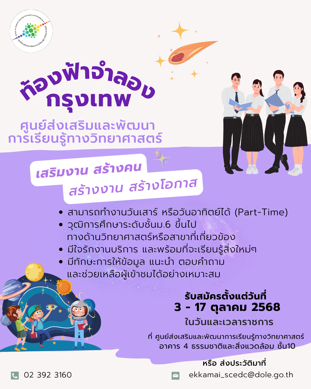 ขอเชิญเข้าร่วมการประกวดแข่งขันนวัตกรรมด้านวิทยาศาสตร์สำหรับผู้สูงวัย “แฮปปี้…สูงวัย” ระดับประเทศ ประจำปีงบประมาณ พ.ศ. 2569 ประเภท สิ่งประดิษฐ์เพื่อช่วยเสริมคุณภาพชีวิตด้านการประกอบอาชีพสำหรับผู้สูงวัย จัดโดยศูนย์ส่งเสริมและพัฒนาการเรียนรู้ทางวิทยาศาสตร์ เพื่อส่งเสริม สนับสนุนและดำเนินการจัดกิจกรรมการเรียนรู้ทางด้านวิทยาศาสตร์และเทคโนโลยี เสริมสร้างทักษะให้กับกลุ่มผู้สูงวัยอย่างต่อเนื่อง โดยเปิดรับผลงานจากบุคคลทั่วไปผู้มีอายุตั้งแต่ 55 ปีขึ้นไป (ต้องผ่านการประกวดระดับพื้นที่จากกลุ่มศูนย์วิทยาศาสตร์เพื่อการศึกษา) ซึ่งผู้ชนะเลิศจะได้รับเงินรางวัล 13,000 บาท พร้อมโล่และเกียรติบัตร และยังมีรางวัลชมเชยอีก 17 รางวัล รวมมูลค่ากว่า 89,000 บาท เงื่อนไขการสมัคร หลักฐานการสมัคร ประกอบด้วย กำหนดการประกวด หมายเหตุ สอบถามรายละเอียด/ติดต่อผู้ประสานงานโครงการ FacebookFacebookXTwitterLINELine