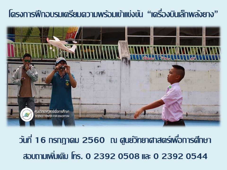 โครงการเตรียมความพร้อมเข้าแข่งขัน “เครื่องบินเล็กพลังยาง” จะจัดในวันที่ 16 กรกฎาคม 2560 ณ ห้อง Magnet ชั้น 1 อาคาร 2 ศูนย์วิทยาศาสตร์เพื่อการศึกษา ค่าลงทะเบียน 500 บาท เปิดรับสมัครครู อาจารย์ นักเรียน หรือผู้สนใจ จำนวน 50 คน ผู้ที่ต้องการเข้ารับการอบรมในโครงการฯ นี้ สามารถสมัครเข้าอบรมตามขั้นตอน ดังนี้