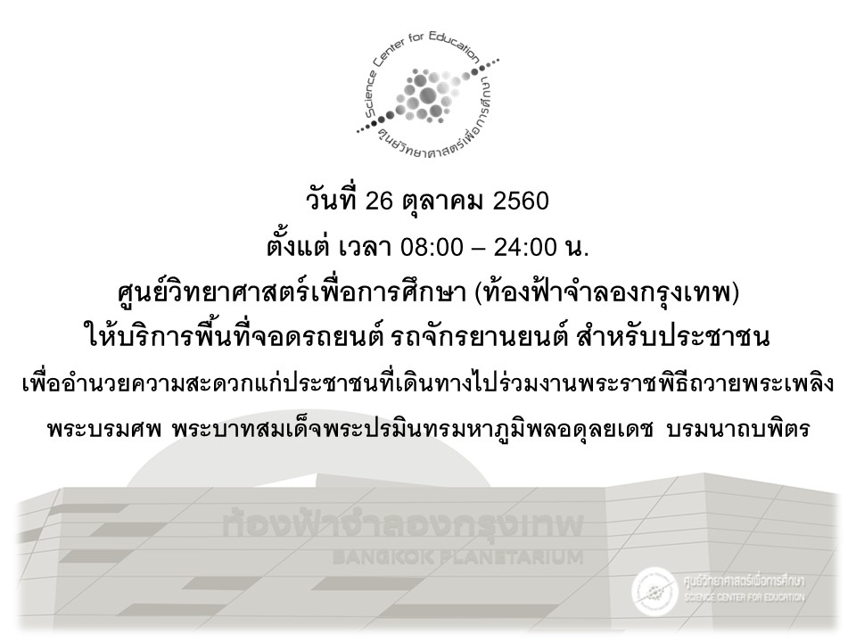 วันพฤหัสบดีที่ 26 ตุลาคม 2560 ศูนย์วิทยาศาสตร์เพื่อการศึกษา (ท้องฟ้าจำลองกรุงเทพ) ให้บริการพื้นที่จอดรถยนต์ รถจักรยานยนต์ ตั้งแต่ เวลา 08.00 – 24.00 น. ให้บริการสำหรับประชาชนที่เดิ
