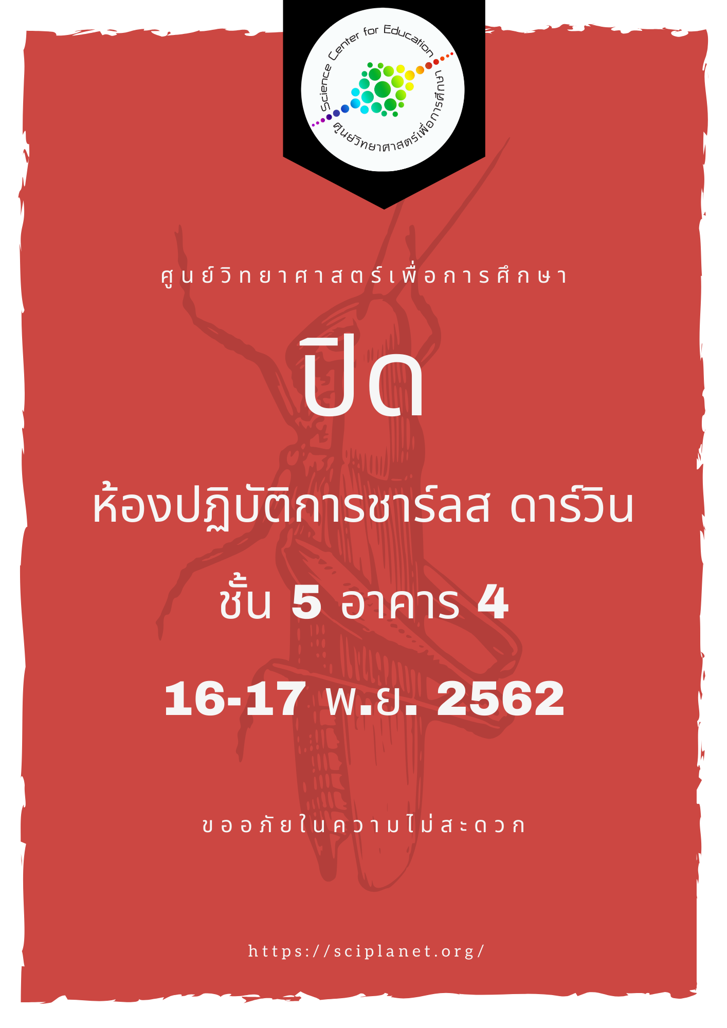 ตามที่งานอาคารสถานที่และบริการ ได้ทำการฉีดสารเคมีเพื่อกำจั ดปลวกในห้องปฏิบัติการชาร์ลส ดาร์วิน เมื่อวันที่ 14 พ.ย. 2562 นั้น ขณะนี้ภายในห้องยังมีกลิ่ นสารเคมีอยู่ เพื่อไม่ให้กลิ่นสารเคมี รบกวนการใช้บริการของประชาชน ฝ่ายธรรมชาติและสิ่งแวดล้อม ส่วนพิพิธภัณฑ์ ศูนย์วิทยาศาสตร์เพื่อการศึกษา จึงขอปิดให้บริการห้องปฏิบัติ การชาร์ลส ดาร์วิน (ชั้น 5 อาคาร 4) ระหว่างวันที่ 16-17 พ.ย. 2562 (ห้องนิทรรศการเปิดให้บริ การตามปกติ) ขออภัยในความไม่สะดวก มา ณ ที่นี้