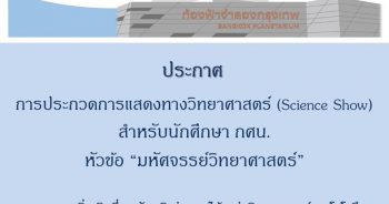 ตามที่ ศูนย์วิทยาศาสตร์เพื่อการศึกษา (ท้องฟ้าจำลองกรุงเทพ) สำนักงาน กศน. ได้จัดโครงการประกวดการแสดงทางวิทยาศาสตร์ (Science Show) สำหรับนักศึกษา กศน. วันที่ 21 กรกฎาคม 2561 มีกลุ่มเป้าหมายเป็นนักศึกษา กศน. ในเขตกรุงเทพมหานคร ซึ่งเป็นการนำร่องและต่อยอดจากการฝึกอบรม “การแสดงทางวิทยาศาสตร์ (Science Show) สำหรับครู กศน.” และเป็นการพัฒนากระบวนการเรียนการสอนด้านวิทยาศาสตร์ของครูและนักศึกษา กศน. ให้มีความน่าสนใจและเกิดประโยชน์สูงสุดต่อการพัฒนาศักยภาพของนักศึกษา กศน. บัดนี้ การประกวดการแสดงทางวิทยาศาสตร์ฯ ได้ดำเนินการเสร็จสิ้นแล้ว ศูนย์วิทยาศาสตร์เพื่อการศึกษา จึงประกาศผลการประกวดการแสดงทางวิทยาศาสตร์ (Science Show) สำหรับนักศึกษา กศน. 2561 เพื่อให้รับทราบโดยทั่วกัน ดังมีรายละเอียดตามไฟล์แนบ หมายเหตุ : ทีมที่ได้รับรางวัล จะเข้ารับรางวัลในพิธีปิดงานสัปดาห์วิทยาศาสตร์แห่งชาติ ปี 2561 ในวันอาทิตย์ที่ 5 สิงหาคม 2561 ณ ศูนย์วิทยาศาสตร์เพื่อการศึกษา ผลการประกวดการแสดงทางวิทยาศาสตร์ (Science Show) สำหรับนักศึกษา กศน. 2561