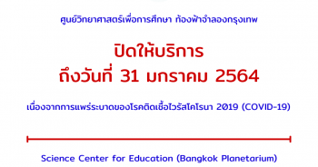 เนื่องจากเกิดการแพร่ระบาดของโรคติดเชื้อไวรัสโคโรนา 2019 (COVID-19) ระลอกใหม่ขึ้น และแพร่กระจายในหลายพื้นที่ของประเทศไทยทำให้จำนวนผู้ติดเชื้อเพิ่มขึ้นอย่างต่อเนื่อง ดังนั้น เพื่อเป็นการป้องกันและควบคุมจำกัดการแพร่ระบาดของโรคติดเชื้อไวรัสโคโรนา 2019 (COVID-19) ศูนย์วิทยาศาสตร์เพื่อการศึกษา จึงขอปิดให้บริการชั่วคราว ถึงวันที่ 31 ม.ค. 64 ตามประกาศกระทรวงศึกษาธิการ ลงวันที่ 2 มกราคม พ.ศ. 2564จึงประชาสัมพันธ์มาให้ทราบโดยทั่วกัน